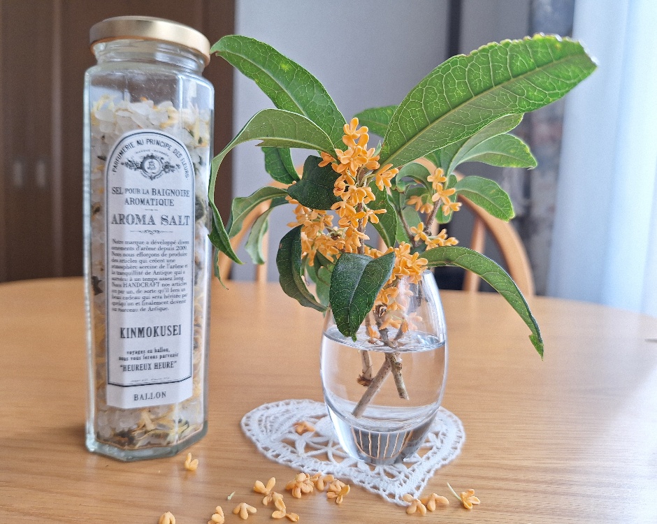 商業施設の雑貨店で何種類もバスソルトがあったのですが、キンモクセイの商品が目に留まったので、購入してみました。